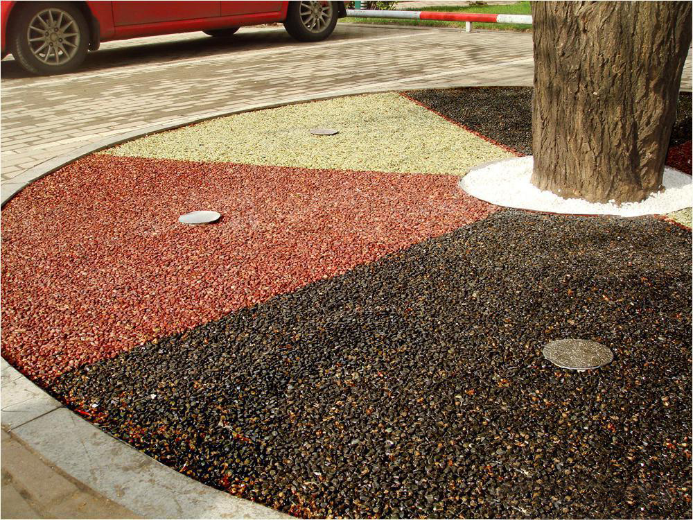 膠粘石透水路面是由改性高分子樹(shù)脂為膠結(jié)材料,將天然彩石、拋光色石、玻璃、水晶石、人造骨料等牢固地粘接在一起,鋪設(shè)在混凝土、透水混凝土、瀝青或級(jí)配砂石基層上的生態(tài)景觀地面鋪設(shè)材料,具有高效透水、自然美觀、色彩多樣、經(jīng)久耐用等特點(diǎn)??捎糜谕杆跃坝^道路、車型或人行道、公園和廣場(chǎng)等場(chǎng)所,也可應(yīng)用到室內(nèi)場(chǎng)所。